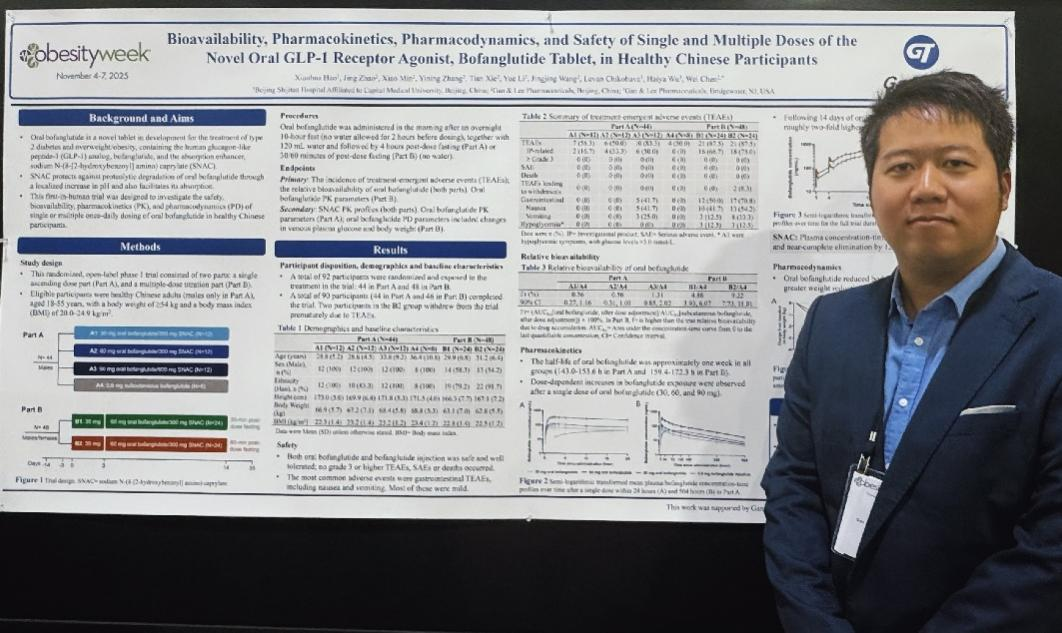 本次会议上,甘李药业口服胰高血糖素样肽-1受体激动剂(GLP-1RA)博凡格鲁肽(研发代号:GZR18)片在中国健康受试者中的I期临床研究结果成功入选ObesityWeek® 2025,并在会议期间进行口头壁报展示。